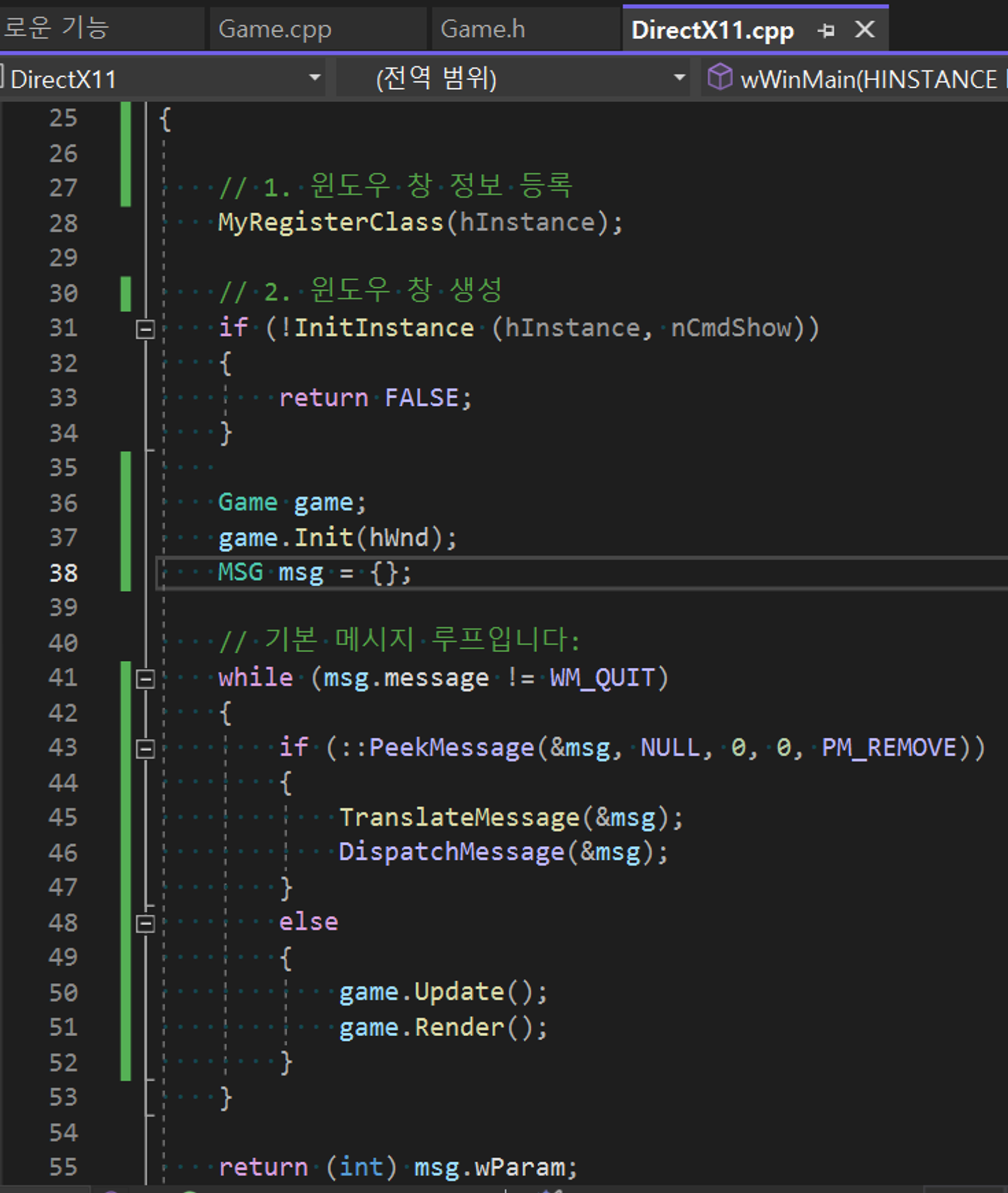 Init 함수의 인수 HWND 는 WinApi의 핸들이다. DirectX11.cpp 파일에서 지역변수로 있던 hwnd 변수를 전역으로 바꾸고 게임 프레임에 맞출수있게 PeekMsg 설정을 해두었다.