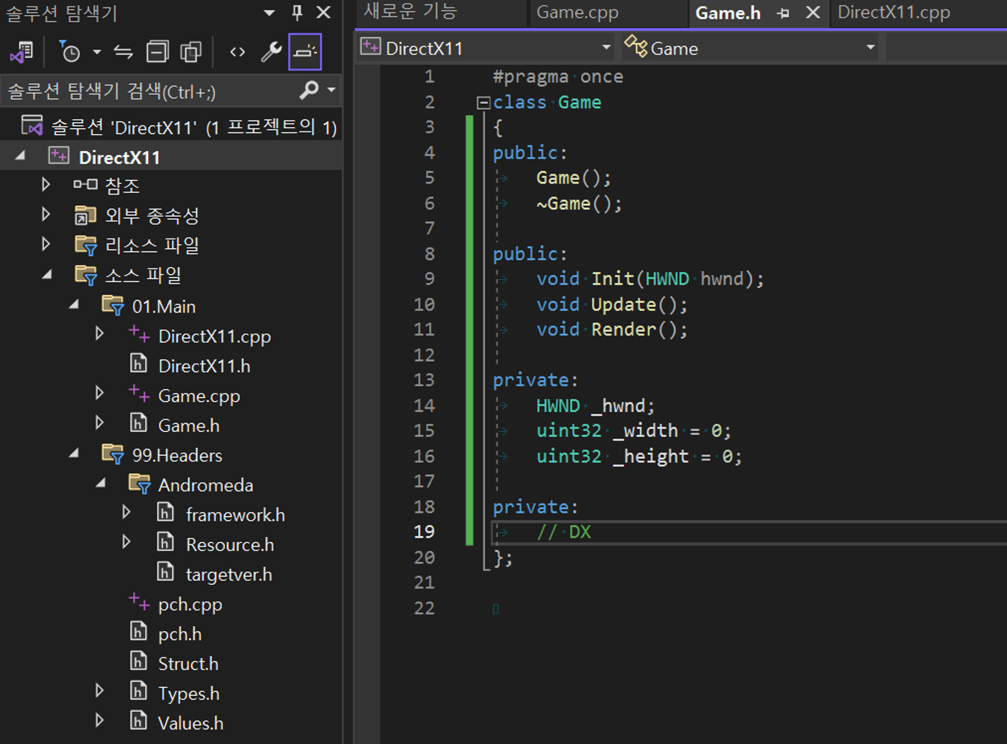 Game 클래스를 생성한 후 기본 Init(), Update(), Render() 함수를 선언한다.