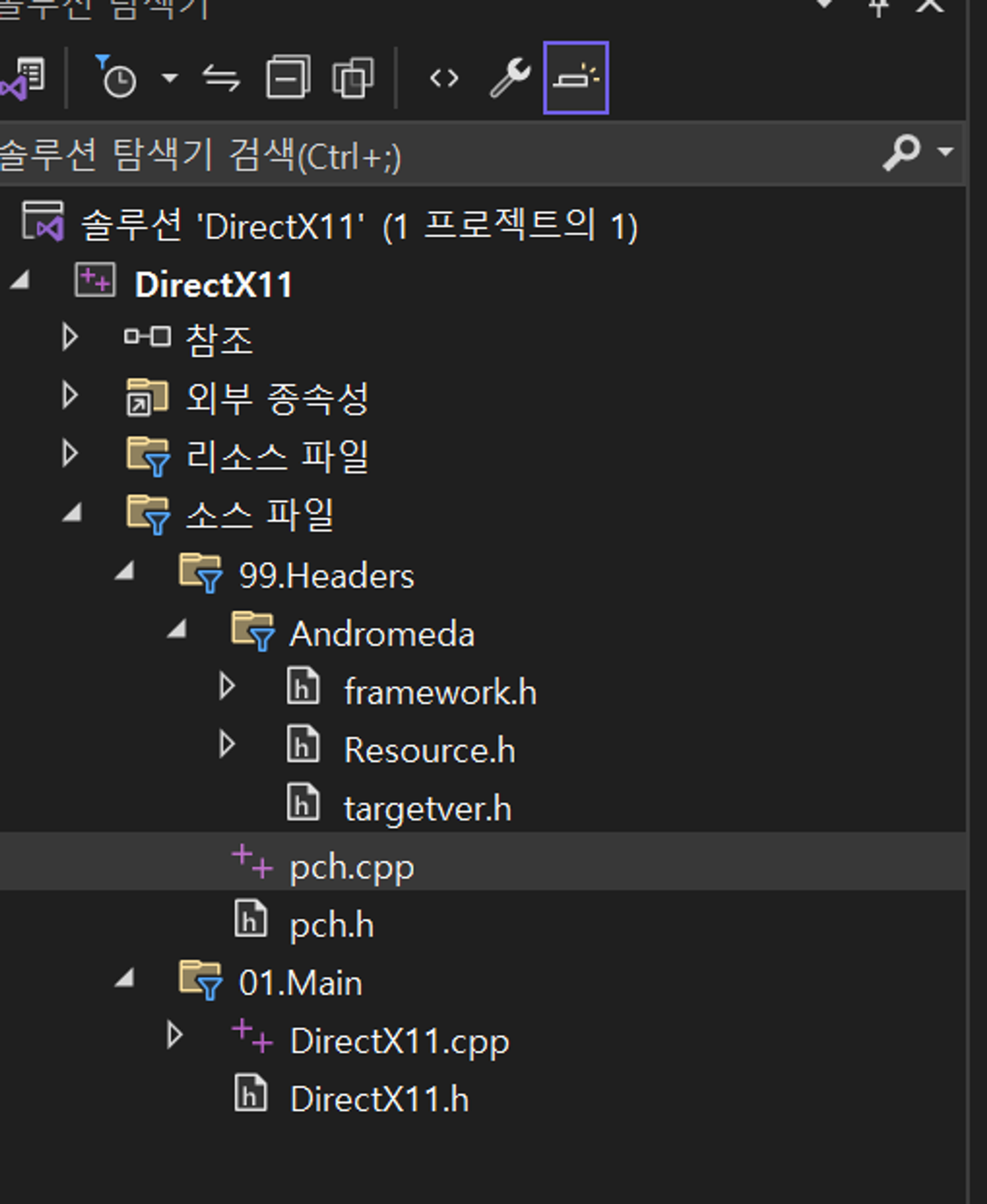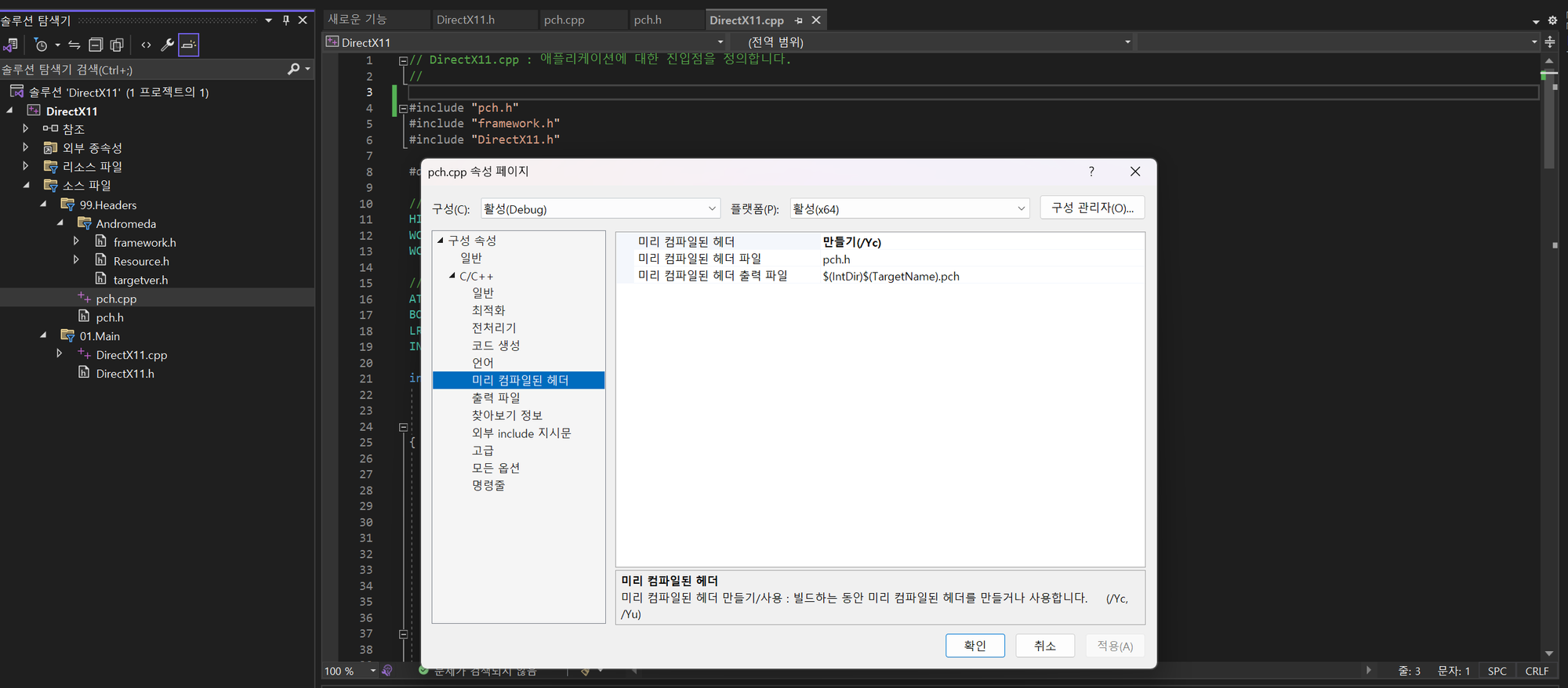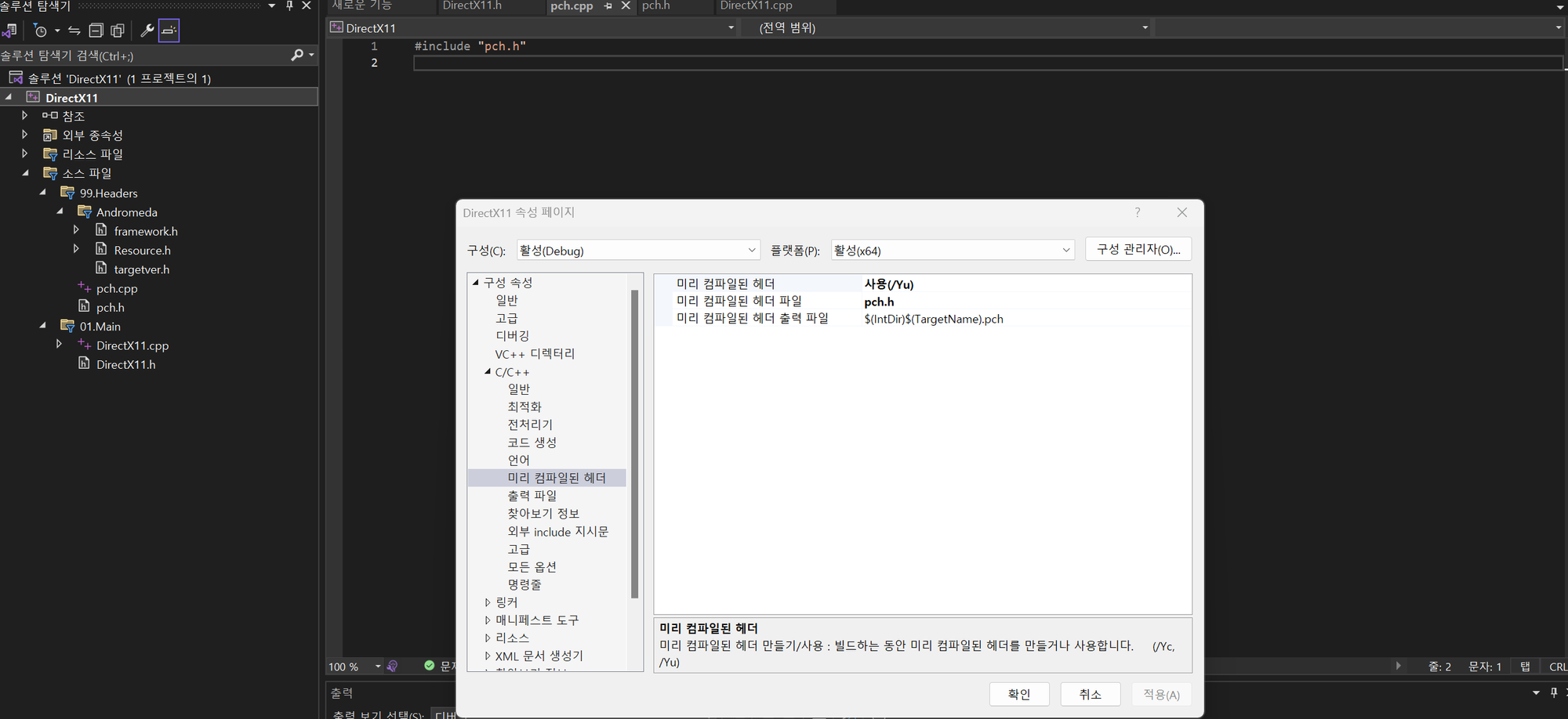 그리고 ‘프로젝트 이름’.cpp 파일에 pch 헤더 파일 include 해준다.