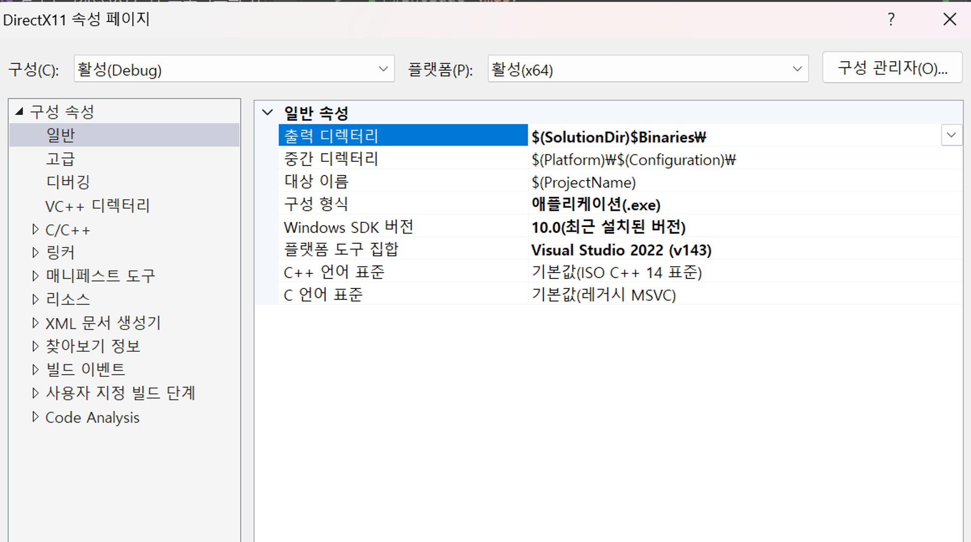 프로젝트 셋팅 → 출력 디렉토리 를 $(SolutionDir)$Binaries\ 경로로 바꾼다.