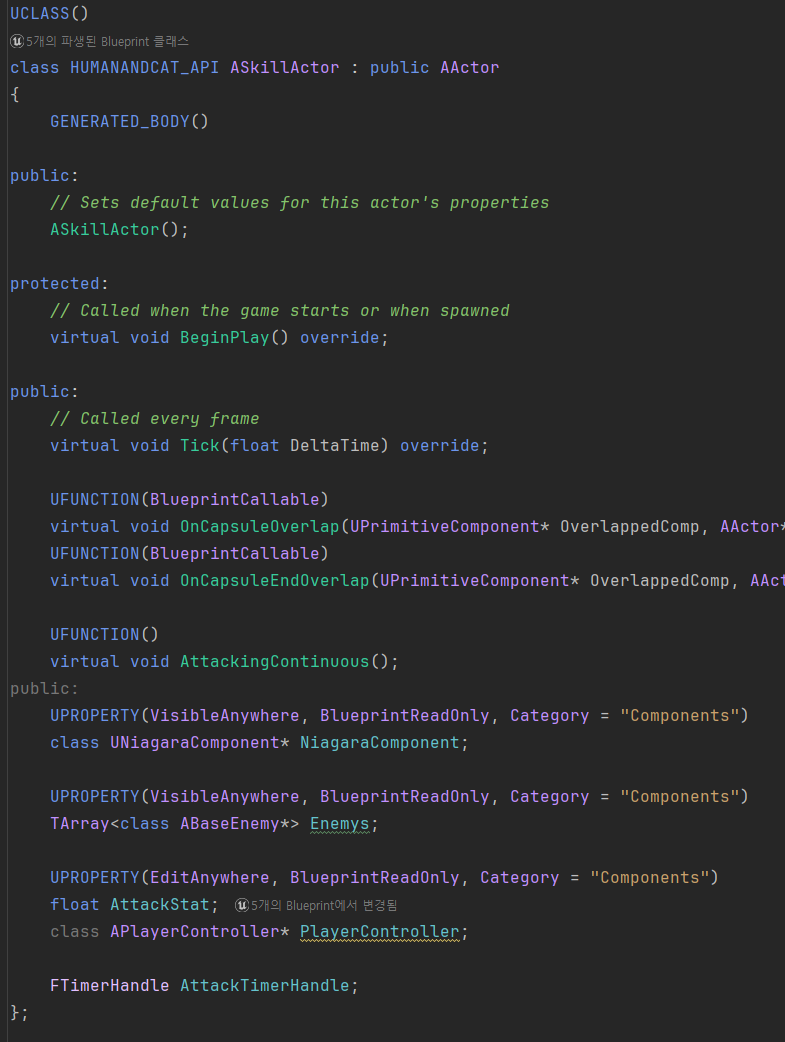 플레이어 캐릭터가 기본 무기로 주먹을 사용하게 만들었고 이때 특별한 StaticMesh 를 사용하지 않았다. 그래서 몬스터를 만들어도 안보이는 기본 무기를 장착하게 만들면 굳이 SkillComponent 를 만들 필요가 없다고 판단해서 Skill 관련 함수를 weapon 에서 만들었다.