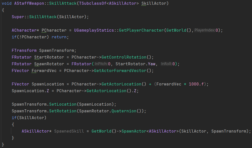 StaffWeapon 이 Skill 사용 할 때 스킬의 Spawn하고 SpawnTrasform 을 설정한다.