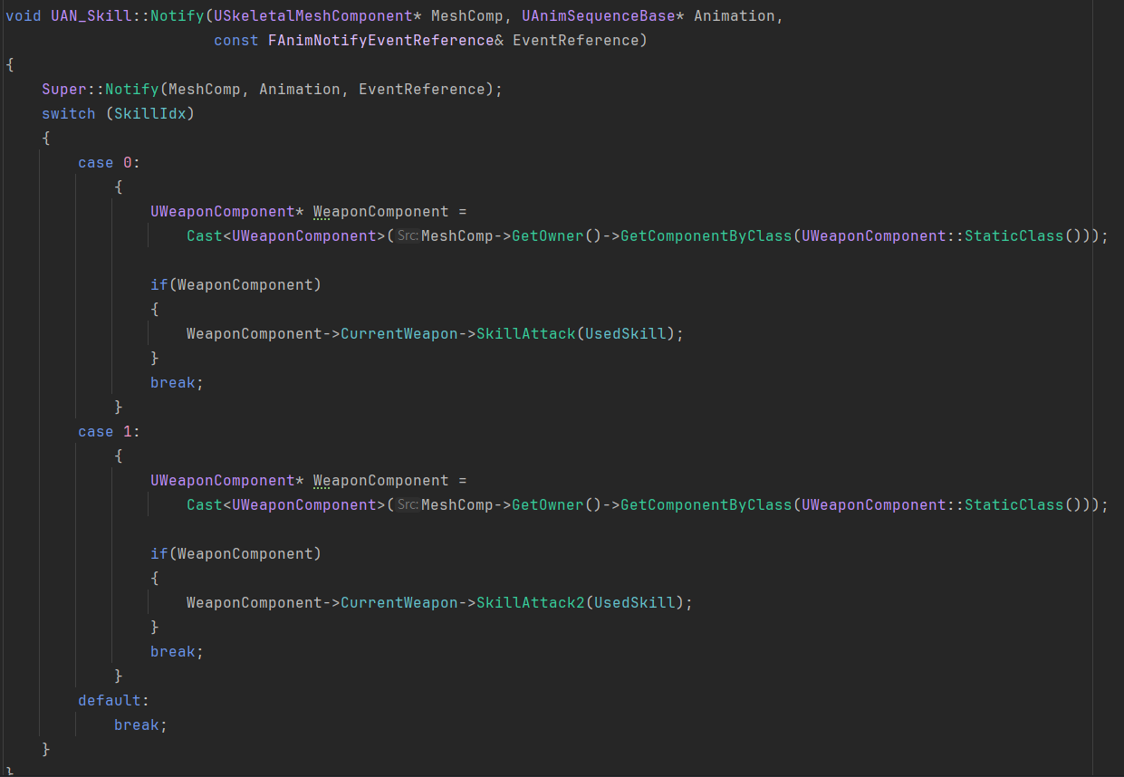 원래 SkillComponent 를 제작하여 Weapon 이 없는 몬스터 등에도 Skill 사용이 가능하도록 만들 예정이었다.