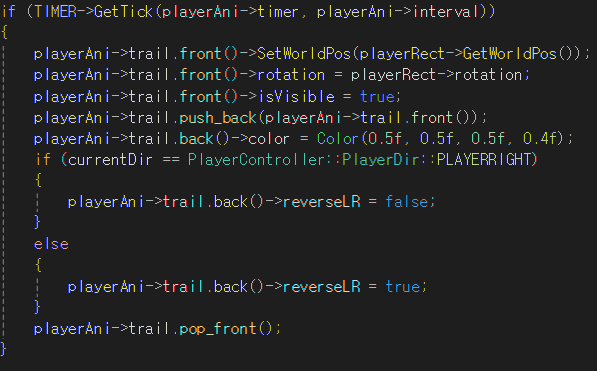 프로젝트 부록 - 모작2 __sapar 2024. 10. 17. 18:21 대쉬 잔상 구현 deque 를 이용하여 대쉬 이미지들을 넣어놓고 일정간격(interval) 마다 deque 의 맨 앞의 잔상 이미지를 맨 뒤로 보내었다. 공유하기 게시글 관리 L_Programing '프로젝트' 카테고리의 다른 글 부록 - 모작1 (0) 2024.10.17 '프로젝트' Related Articles 부록 - 모작1
