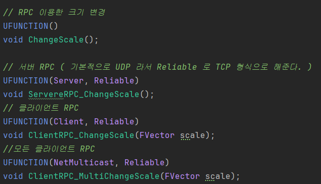 언리얼의 RPC 는 기본적으로 UDP처럼 신뢰성이 보장되지 않아서 TCP 처럼 신뢰성을 추가하기 위해 Reliable 선언해야한다. 당연히 신뢰성 보장이 필요없다면 상관없다.