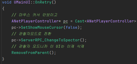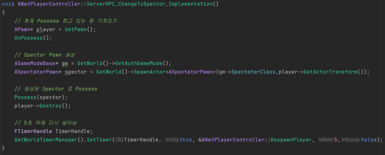4. ServerRPC 로 서버에서 Possess 를 진행 즉, 사망한 객체는 서버에게 Possess 스위칭을 요청한다.