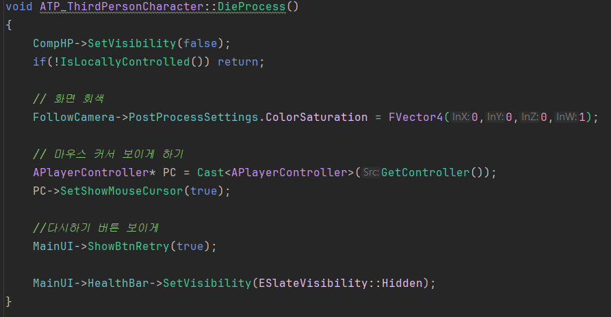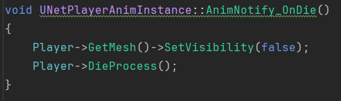 1. 사망 시 애니메이션에서 노티파이로 OnDie 실행. 죽은 클라이언트의 Mesh 를 숨기면서 DieProcess() 실행