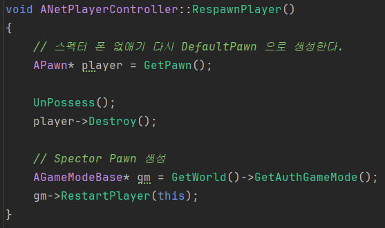 5. RespawnPlayer 함수가 ServerRPC 에서 TimerManager 에 의해 예약 되었으므로 실제 실행은 서버에서 호출되는 것이라서 gm 을 가져올 수 있다.
