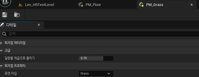 1. 프로젝트 셋팅에서 Surface 설정으로 Grass 와 Wood 를 추가하고 각 표면에 맞는 피직스 머터리얼들을 생성한다.