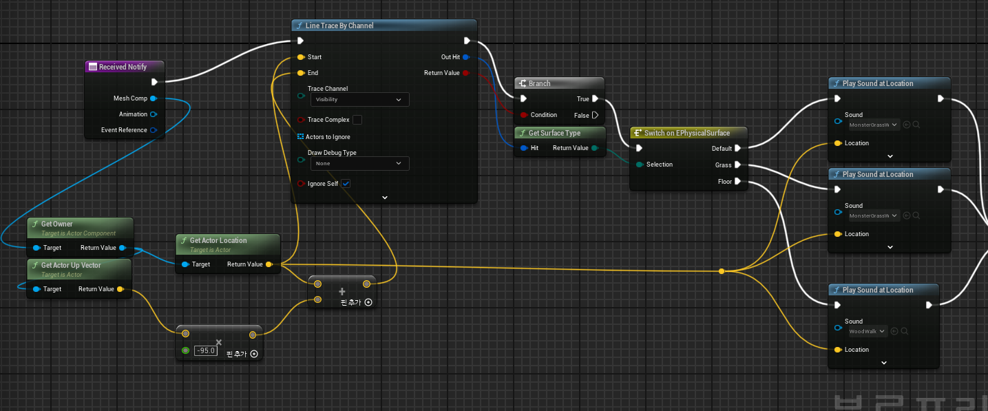 4. 플레이어가 움직일 때 걷는 순간 마다 AnimNotify 로 아래로 라인트레이스하고 HitActor 의 Surface 마다 사운드를 교체한다.