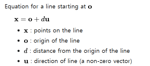 다음은 라인트레이스이다. 라인트레이스에서 x 도 이 선 위의 임의의 점을 의미한다. 여기서 라인트레이스를 특정 하나의 레이 트레이싱으로 취급할 수 있다. o 는 시작 점, u 는 방향이다.
