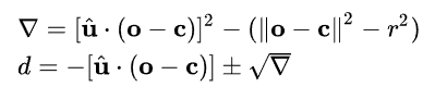 - nabla < 0 d 값을 보면 nabla 에 루트를 씌웠다. nabla 가 음수면 d 가 허수가 되므로 부딪히지 않은것으로 간주한다.