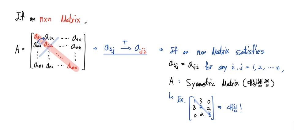 만약 임의의 i, j (i,j = 1, 2, ..., n)에 대해서 a(i,j) = a(j,i) 이 성립한다면 전치하여도 기존의 행렬과 전치행렬이 같을 것입니다.