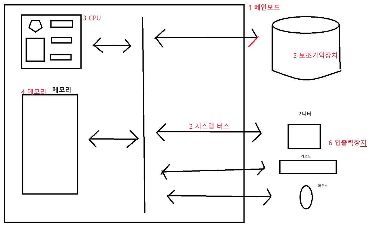 - 보조기억장치는 메인보드 내 시스템 버스와 연결되어 있다.